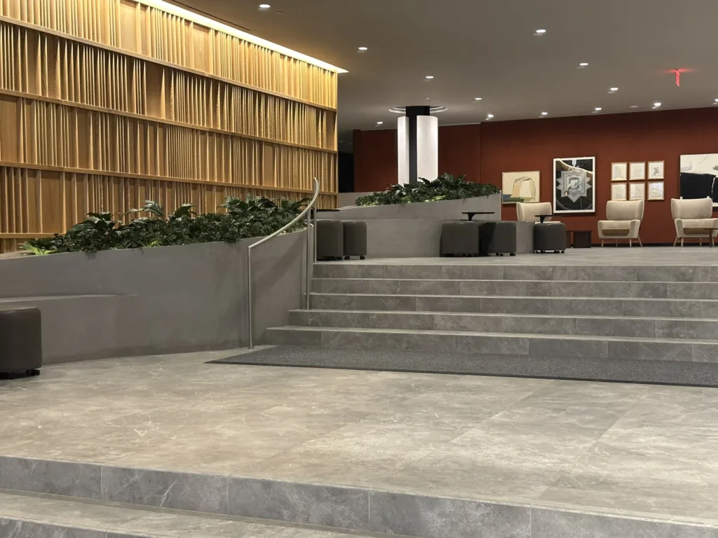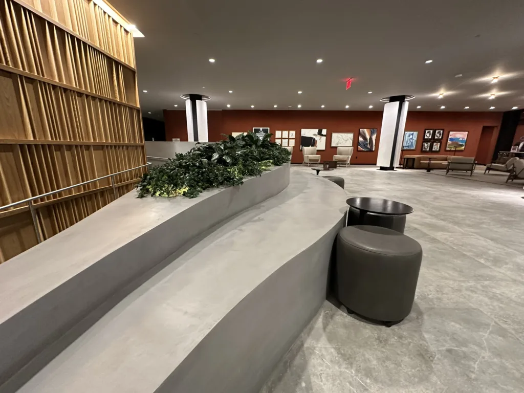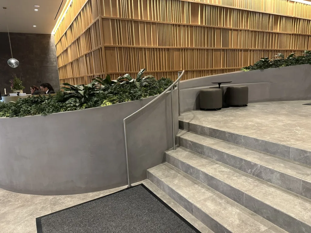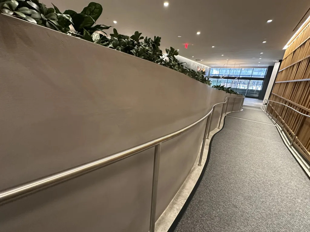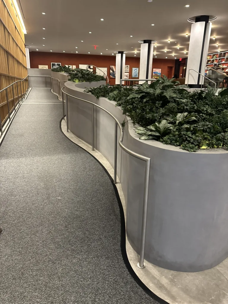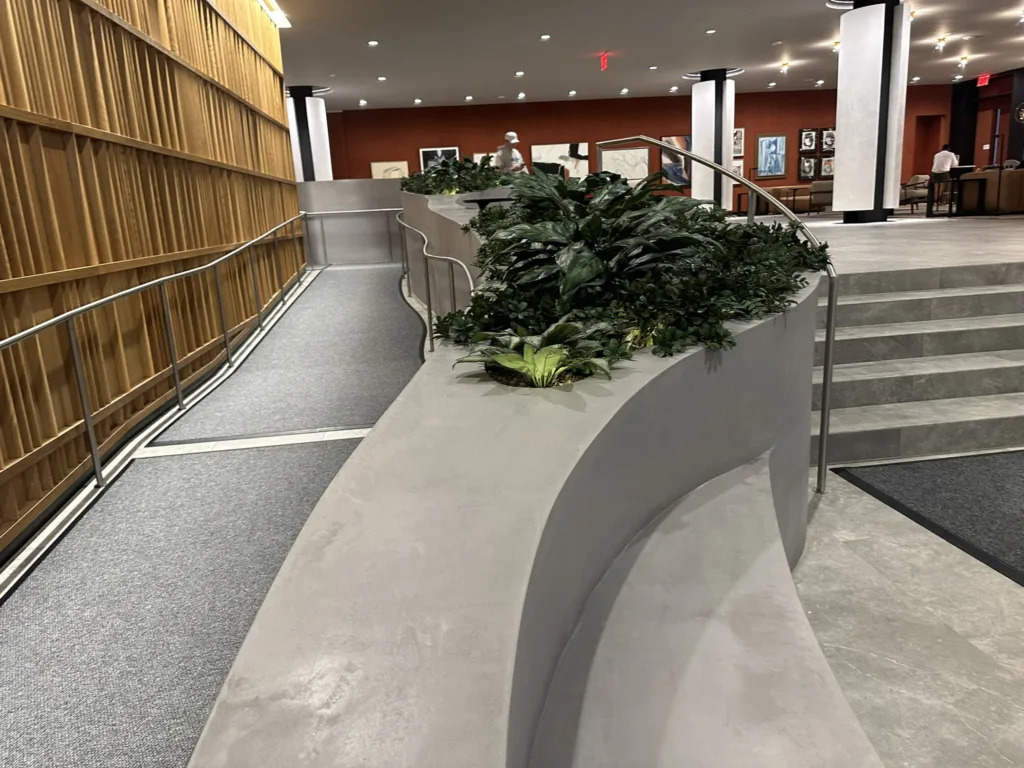 One of our standout projects, 25 Water, is located in the heart of New York City and features four custom-designed bench-planter combinations. The centerpiece is an expansive 25′ x 60′ bench-planter that elegantly connects three levels within the building’s lobby. This stunning installation serves as both a functional seating area and a vibrant planter, blending modern architecture with green spaces. Additionally, two more bench-planter combos were designed for the 25th floor of the skyscraper, offering a seamless blend of seating and greenery in a high-rise setting. The final bench-planter combo is located in the building’s luxurious spa, creating a relaxing, nature-inspired retreat. The project consists of over 140 3D printed pieces, assembled on-site and finished with a sleek micro-crete coating for durability and a contemporary aesthetic.
