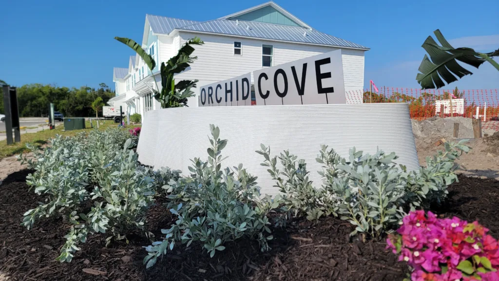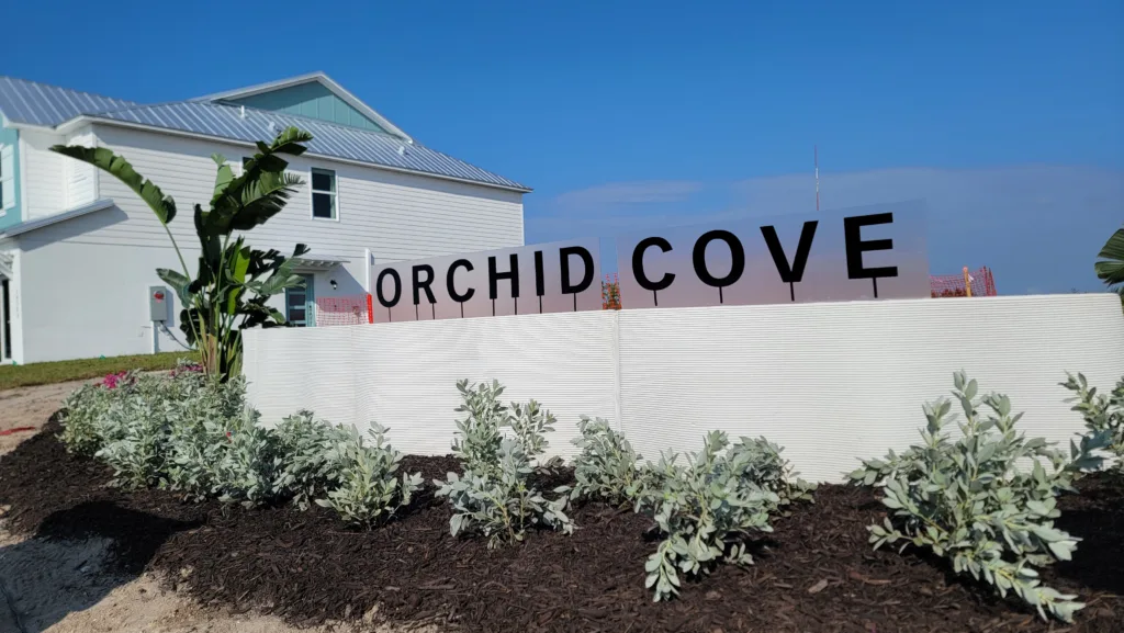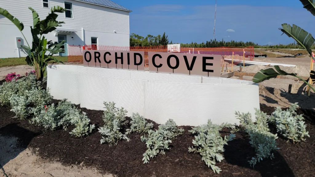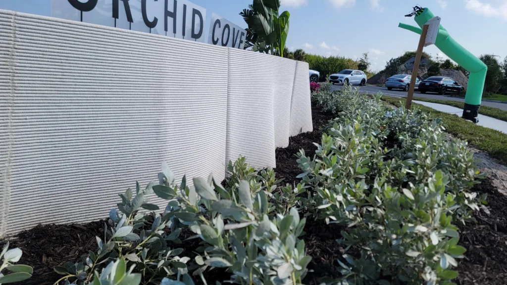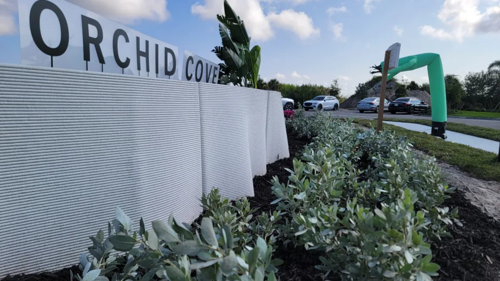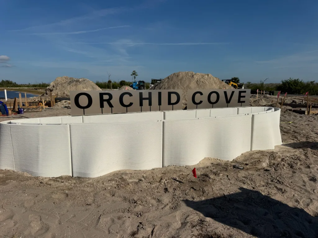 This 3D-printed concrete monument serves as the entry signage for Orchid Cove and represents the first completed element in a series of custom 3D-printed features for this new housing community. Already installed, the print will be filled with landscaping prior to the community opening, allowing it to function as both a planter and a bold entry landmark. This project highlights the versatility of 3D-printed concrete in creating durable, architectural elements tailored specifically to place. More updates coming soon, including a look at the community’s exclusive, custom-designed pool deck features.